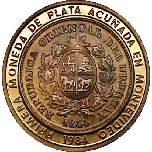 | Leyenda del anverso | PRIMERA MONEDA DE PLATA ACUÑADA EN MONTEVIDEO REPÚBLICA ORIENTAL DEL URUGUAY 1844 1984 (Translation: The first silver coin that was struck in Montevideo) |