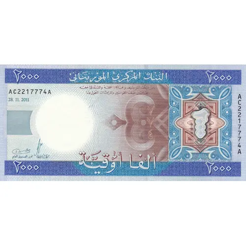 | Obverse lettering | البنك المركزي الموريتاني ألفي أوقية ٢٠٠٠ (Translation: Central Bank of Mauritania, 2000 Two Thousand Ouguiya) |
