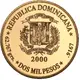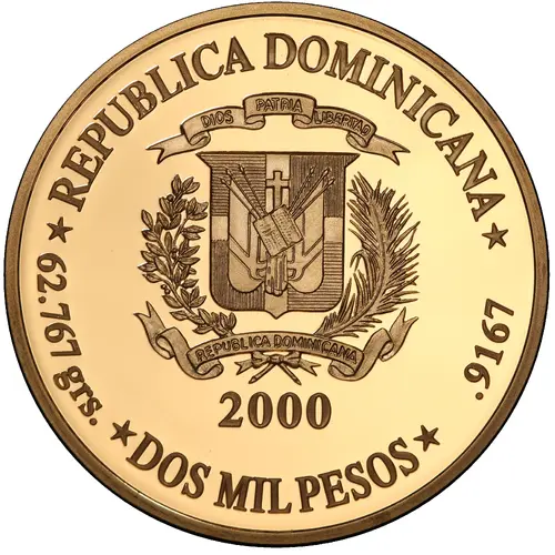 | Obverse lettering | REPUBLICA DOMINICANA 62.767 grs. DOS MIL PESOS .9167 (Translation: Dominican Republic Two Thousand Pesos) |