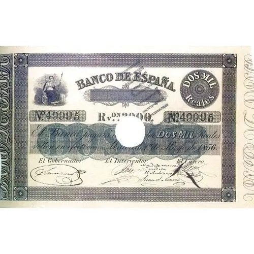 BANCO DE ESPAÑA DOS MIL Reales Rv ON 2000. El Banco pagará al portador DOS MIL Reales vellón en efectivo Madrid 1º de Mayo de 1856. El Gobernador El Cajero (Translation: Bank of Spain Two Thousand Reales Reales Vellon 2000 The Bank will pay the bearer Two Thousand Reales vellon in cash Madrid, May 1, 1856. The Governor The Cashier) |