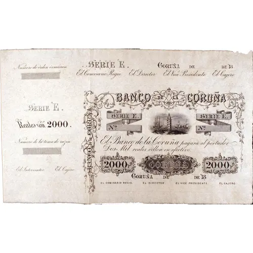 BANCO DE LA CORUÑA El Banco de la Coruña pagará al portador Dos Mil reales vellon en efectivo 2000 r/s CORUÑA 2000 r/s CORUÑA ... DE ... DE 18... EL COMISARIO REGIO / EL DIRECTOR / EL VICEPRESIDENTE / EL CAJERO (Translation: Bank of A Coruña The Banco de la Coruña will pay the bearer Two Thousand reales vellon in cash 2000 r/s Coruña 2000 r/s Coruña... of... of 18... The Royal Commissioner / The Director / The Vice President / The Cashier) |