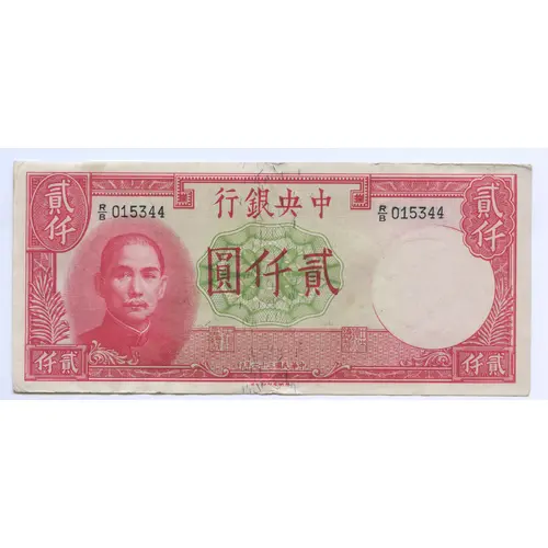 | Obverse lettering | 行銀央中 圓仟貳 印年一十三國民華中 (Translation: Central Bank of China Two Thousand Yuan Printed in the 31st year of the Republic) |