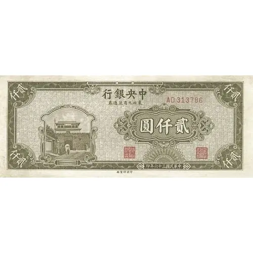 | Obverse lettering | 行銀央中 券通流省九北東 圓仟貳 印年六十三國民華中 (Translation: Central Bank of China Circulation Notes in Northeastern 9 Provinces Two Thousand Yuan Printed in the 36th year of the Republic of China) |