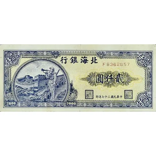 | Obverse lettering | 行銀海北 仟貳 F8362857 圓仟貳 印年七十三國民華中 2000 (Translation: Pei Hai Bank Two thousand Two thousand yuan Printed in the year 37 of the Republic of China) |