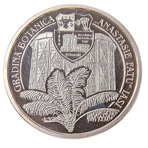 | Obverse lettering | Pe aversul medaliei sunt reprezentate sera-turn a Grădinii Botanice din Iaşi, în centru, un palmier (Chrysalidocarpus lutescens) dedesubtul acesteia, iar deasupra, stema instituţiei aniversate. La exterior este inscripţionat textul GRADINA BOTANICA `ANASTASIE FATU` Iaşi. (Translation: The obverse of the medal depicts the tower-greenhouse of the Botanical Garden of Iaşi, in the center, a palm tree (Chrysalidocarpus lutescens) below it, and above, the coat of arms of the institution celebrating the anniversary. On the outside, the text GRADINA BOTANICA `ANASTASIE FATU` Iaşi is inscribed. The reverse shows in the center a group of gentian flowers (Gentiana asclepiadea), and on the outside, the text `150 YEARS OF ESTABLISHMENT` and the anniversary years, 1856 and 2006.) |