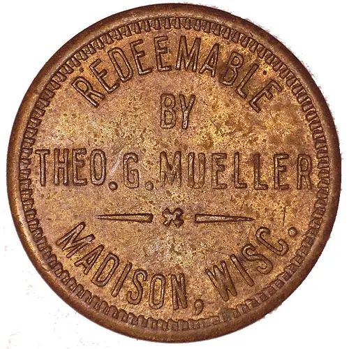 | Obverse lettering | REDEEMABLE BY THEO. G. MUELLER MADISON, WISC. |