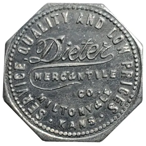 | Obverse lettering | SERVICE, QUALITY AND L I W PRICES Dieter MERCANTILE CO. MILTONVALE KANS |