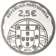The coat of arms of Portugal with the country`s name `REPÚBLICA PORTUGUESA` (Portuguese Republic) and the face value `2.5€` above. The year is at the bottom of the coat of arms. On the sides are the names of the engravers `BANDERIA - DELGADO` for José Bandeira and Nunes Delgado, and the letters `INCM` to mark the workshop. |