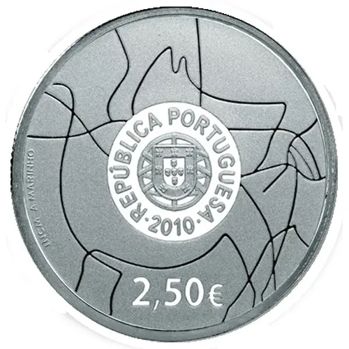 Overlapping rock paintings, in the center appears the coat of arms of Portugal, with the inscriptions `2010` and `REPÚBLICA PORTUGUESA`. At the bottom the face value 2.50€ and more on the left the mark of the workshop `INCM` and the name of the artist `A.MARINHO`. |