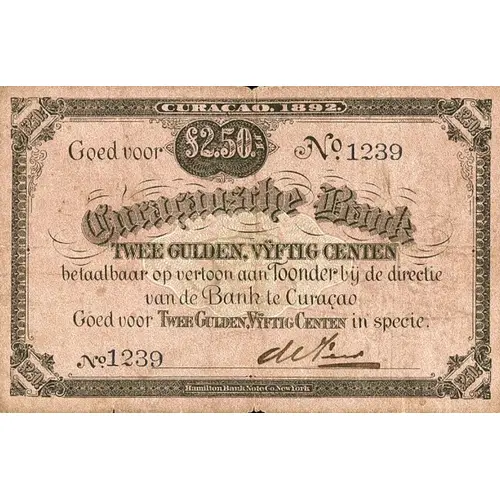 | Obverse lettering | CURAÇAO, 1892. Goed voor f 2.50. Nº1239 Curaçaosche Bank TWEE GULDEN, VŸFTIG CENTEN betaalbaar op vertoon aan Toonder bÿ de directie van de Bank te Curaçao Goed voor TWEE GULDEN, VŸFTIG CENTEN in specie. Hamilton Bank Note Co., New York (Translation: CURACAO, 1892. Good for f. 2.50. Nº1239 Curacao Bank Two Gulden, fifty cents payable on presentation to Bearer at the management of the Bank in Curaçao Good for Two Gulden, fifty cents in specie. Hamilton Bank Note Co., New York) |