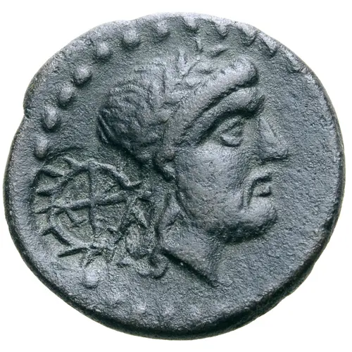 | توضیحات روی سکه | Laureate head of Zeus right; countermark: radiate wheel of four spokes. |