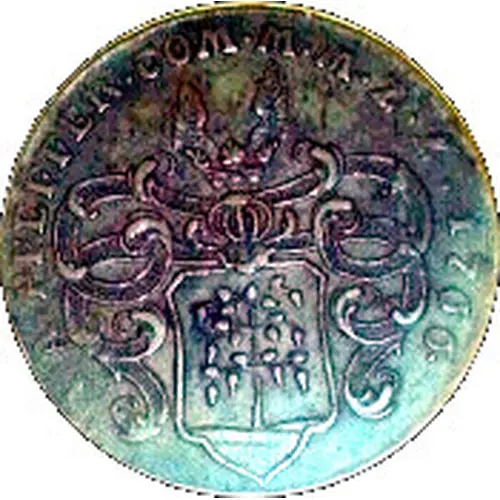 aster`s Coat of Arms with a pepper bush. Inscription around Script: Latin Lettering: I · A · PFEFFER · COM · M · M · Z · Z · 1766 Translation: Johann Anton Pfeffer Comes Marchio Messeranae Et Zellerfeld Engraver: A. Pfeffer Reverse Two miners wor |