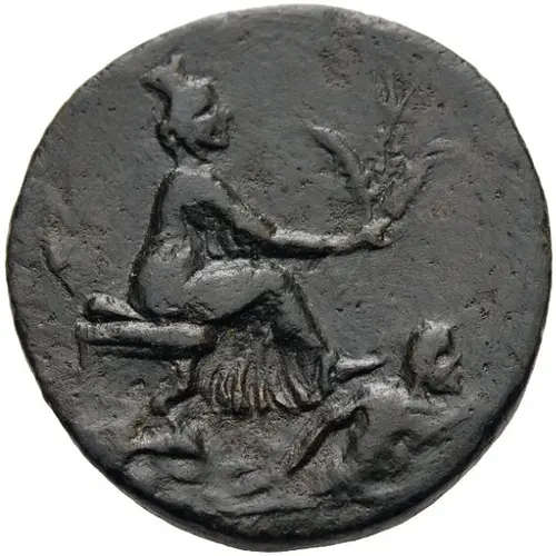| Aversbeschreibung | Tyche seated to right, holding grain ears and resting foot on the shoulder of the river god Kydnos swimming right |