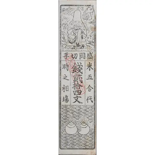 | Obverse lettering | 手切岡盛 米五合代 錢 貮 拾 四 文 時之相塲 藏元改 (Translation: Morioka bill Rice five Gō substitute Cash twenty-four Mon Market price that time Kuramoto examined) |
