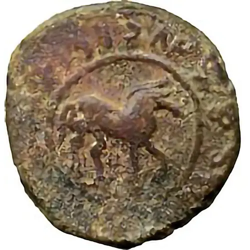 | Описание аверса | Horse walking right surrounded by Kharosthi legend. |