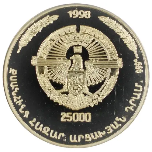 Historical Context: The 25 000 Drams Astghik coin, issued by Artsakh in 1998, represents a crucial step in nation-building for the de facto independent republic post-First Nagorno-Karabakh War. As an unrecognized state, Artsakh utilized its own currency to assert national identity and sovereignty. Featuring Astghik, the Armenian goddess of love, beauty, and water, this high-denomination commemorative symbolized cultural continuity and aspirations for prosperity amidst reconstruction.