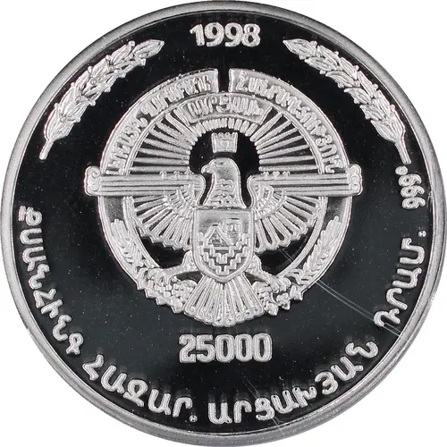 Historical Context: Issued by the de facto Republic of Artsakh in 1998, the 25 000 Drams Monte Melkonian coin holds profound significance as KM#1, marking an early assertion of national identity for the nascent state. Following the first Nagorno-Karabakh War, Artsakh sought to solidify its sovereignty and commemorate its heroes. Monte Melkonian, an Armenian-American commander, became a revered figure for his pivotal role, tragically dying in 1993. This coin serves as a powerful numismatic tribute to his legacy and Artsakh's self-determination.