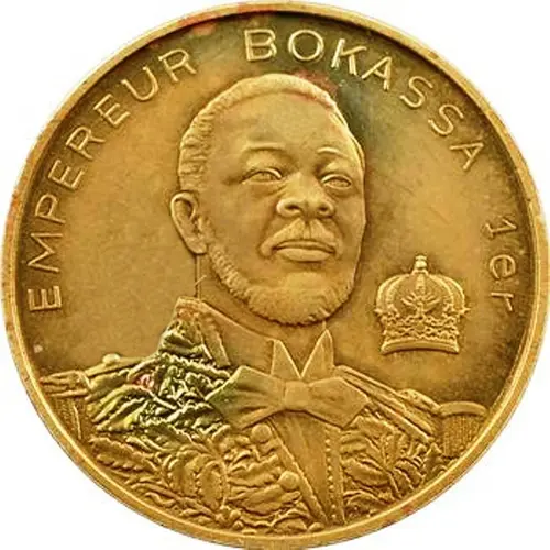 | Obverse description | Bust of Jean-Bedel Bokassa, in uniform, an imperial crown on the right. |