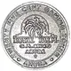 Circle formed by a continuous ring round the whole edge. Inside the ring, forming an upper semicircle, the caption: TWENTY FIVE CENT GAMING TOKEN; and forming a semicircle inferior to the word: • ARUBA •. In the center of the piece is the Royal Palm Casino logo, formed by a palm tree surrounded by a starry semicircle; being below the palm tree the words, read from top to bottom: ROYAL PALM CASINO ARUBA GDC. |