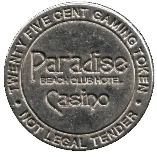 | Obverse lettering | Twenty five Cents gaming token Not legal tender Paradise Beach Club Hotel Casino |