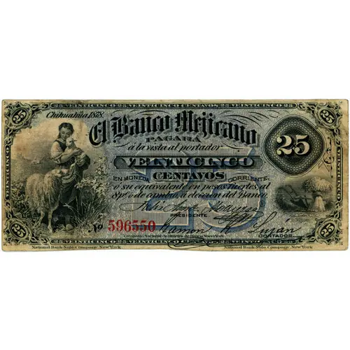 National Bank-Note Company, New York. EL BANCO MEJICANO 25 25 VEINTICINCO CENTAVOS Compañia Nacional de Billetes de Banco, Nueva York. (Translation: National Banknote Company, New York. The Mexican Bank 25 25 Twenty-five centavos National Banknote Company, New York.) |