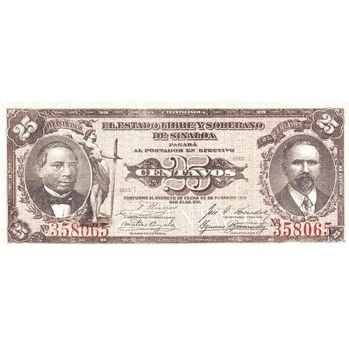 EL ESTADO LIBRE Y SOBERANO DE SINALOA PAGARÁ EL PORTADOR EN EFECTIVO 25 CENTAVOS CONFORME AL DECRETO FECHA 22 DE FEBRERO 1914 SAN BLAS, SIN. (Translation: The Free and Sovereign State of Sinaloa will pay the bearer in cash 25 Cents conforming to the decree dated 22 February 1914. San Blas, Sinaloa) |