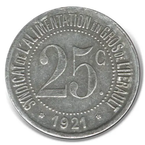 | Obverse lettering | SYNDICAT DE L`ALIMENTATION EN GROS DE L`HERAULT 25c. * 1921 * |