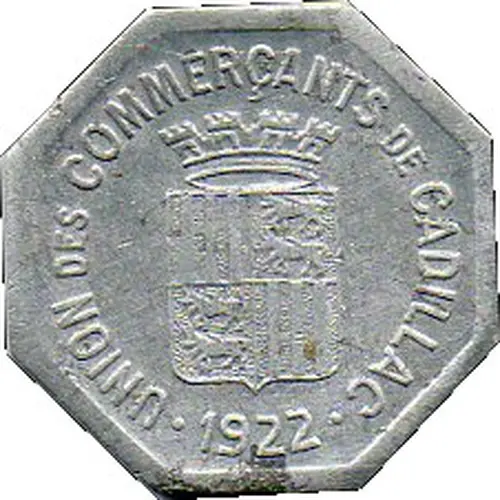 Obverse lettering UNION DES COMMERÇANTS DE CADILLAC · 1922 ·