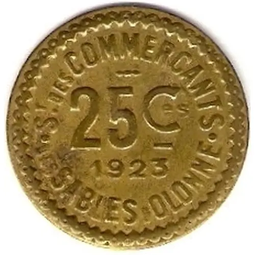 | Ön yüz lejandı | ST. DES COMMERÇANTS 25 Ces 1923 · DES SABLES D`OLONNE · |