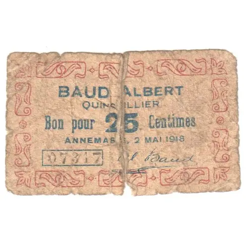 | Legenda do anverso | BAUD ALBERT Bon pour 25 Centimes Annemasse 2 MAI 1918 |