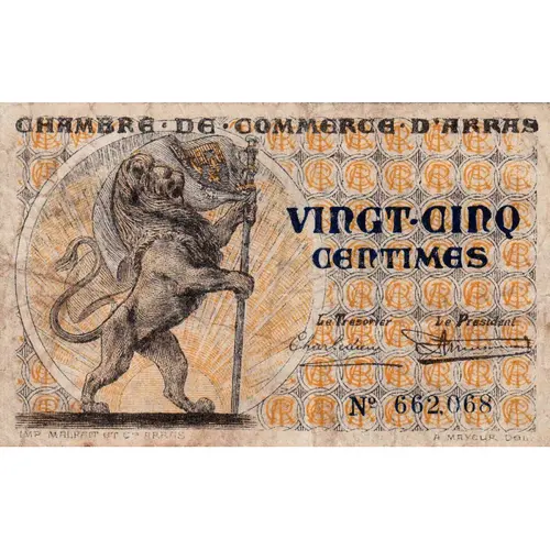 Obverse lettering CHAMBRE DE COMMERCE D`ARRAS VINGT-CINQ CENTIMES Le Trésorier Le Président Nº 603, 431 IMP. MALFAIT ET Cie ARRAS A. MAYEUR Del.