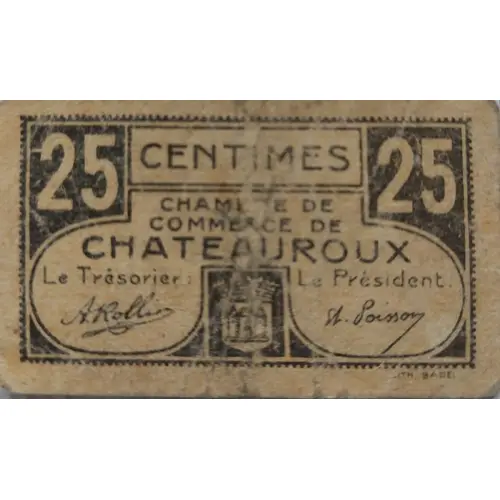 25 CENTIMES 25 CHAMBRE DE COMMERCE DE CHATEAUROUX Le Trésorier Le Président (Translation: 25 Cents Chamber of Commerce of Chateauroux The Treasurer The President) |