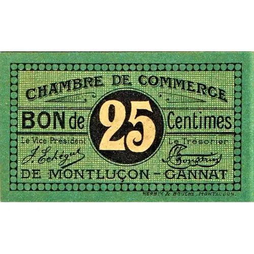 | Obverse lettering | CHAMBRE DE COMMERCE BON de 25 Centimes DE MONTLUÇON - GANNAT Le Vice-Président Le Trésorier HERBIN & BOUCHÉ _ MONTLUCON _ |