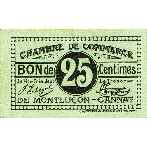 | Obverse lettering | CHAMBRE DE COMMERCE BON de 25 Centimes DE MONTLUÇON - GANNAT Le Vice-Président Le Trésorier HERBIN & BOUCHÉ _ MONTLUCON _ |