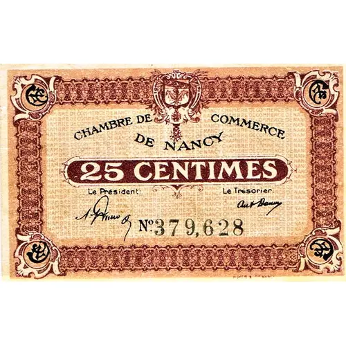 | Obverse lettering | CHAMBRE DE COMMERCE DE NANCY 25 CENTIMES Le Président Le Trésorier N° 379,628 BERGER-LEVRAULT NANCY-PARIS-STRASBOURG |