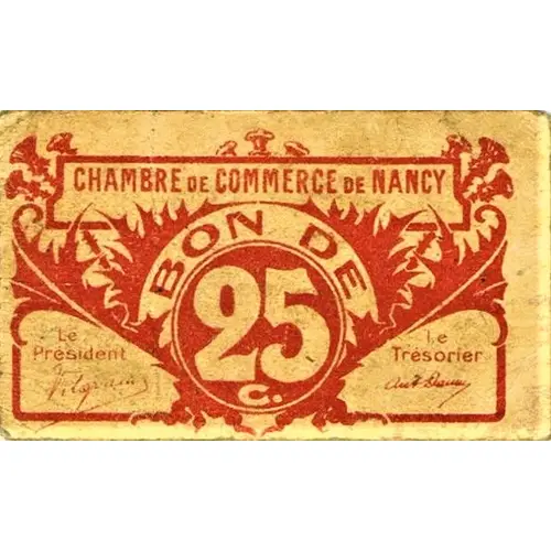 | Obverse lettering | CHAMBRE DE COMMERCE DE NANCY BON DE 25 c. Le Président Le trésorier |