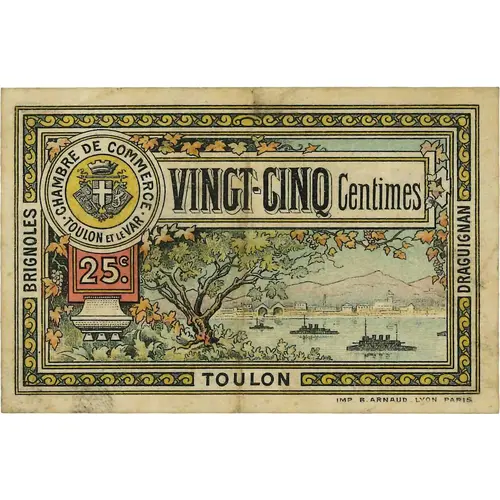 | Obverse lettering | CHAMBRE DE COMMERCE TOULON ET LE VAR 25 c VINGT-CINQ CENTIMES BRIGNOLES - TOULON - DRAGUIGNAN IMP B. ARNAUD _ LYON PARIS |