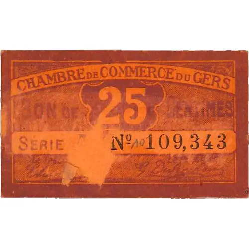 CHAMBRE DE COMMERCE DU GERS BON DE 25 CENTIMES SÉRIE Nº109,343 |