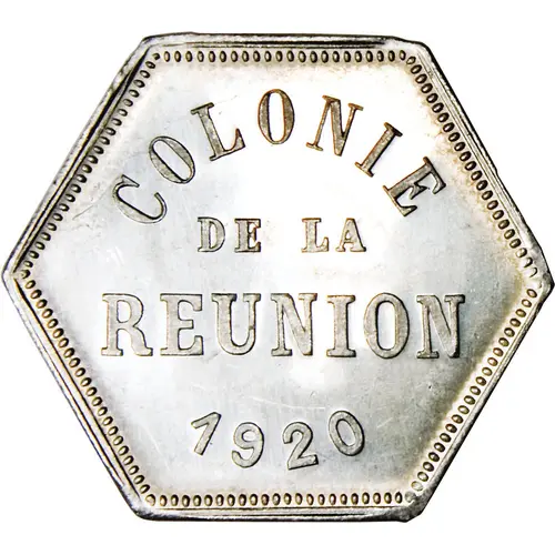 Obverse description `COLONIE` written along an upper half-circle, `DE LA REUNION` in the middle and 1920 written along a lower half-circle.