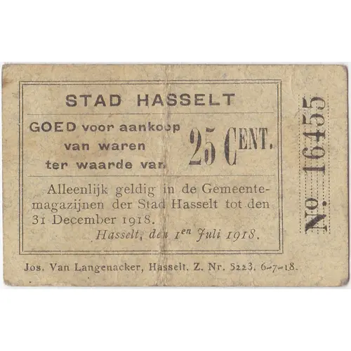 | Obverse lettering | STAD HASSELT GOED voor aankoop van waren ter waarde van 25 CENT. Alleenlijk geldig in de Gemeente- magazijnen der Stad Hasselt tot den 31 December 1918. Hasselt, den 1en Juli 1918. Imp. Van Langenacker, Hasselt. Z. Nr. 5221. 6-7-18. N° 16455 |