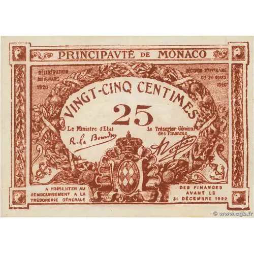 نوشته‌های روی اسکناس PRINCIPAUTÉ DE MONACO Délibération du 16 mars 1920 Décision souveraine du 20 mars 1920 VINGT-CINQ CENTIMES 25 Le Ministre d’Etat R. le Bourdon Le Trésorier Général des Finances A.Noghès A PRÉSENTER AU REMBOURSEMENT A LA TRESORERIE GENERALE DES FINANCES AVANT LE 31 DÉCEMBRE 1922