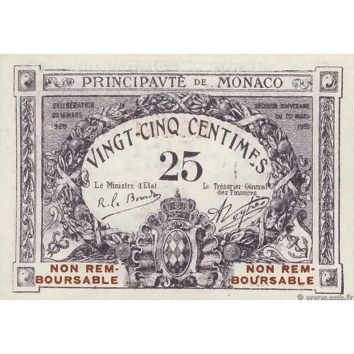 PRINCIPAUTÉ DE MONACO Délibération du 16 mars 1920 Décision souveraine du 20 mars 1920 VINGT-CINQ CENTIMES 25 Le Ministre d’Etat R. le Bourdon Le Trésorier Général des Finances A.Noghès NON REM - BOURSABLE |