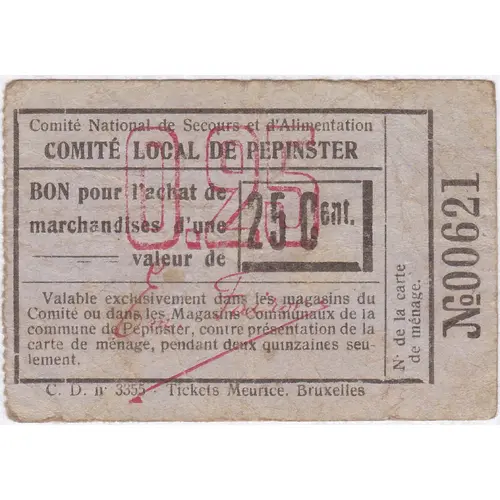 Comité National du Secours et d`Alimentation COMITÉ LOCAL DE PEPINSTER (ligne horizontale) BON pour l`achat de marchandises d`une valeur de (dans un cadre :) 25 CENT. (ligne horizontale) Valable exclusivement dans les magasins du Comité ou dans les Magasins communaux de la commune de Pepinster, contre présentation de la carte de ménage, pendant deux quinzaines seu- lement. C.D. n° 3355 - Tickets Meurice . Bruxelles (dans un cadre vertical à droite :) N° de la carte de ménage. (hors cadres :) N°00621 |