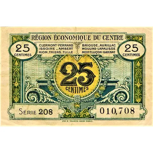 | Obverse lettering | REGION ECONOMIQUE DU CENTRE Clermont-Ferrand, Issoire, Ambert, Riom, Thiers, Tulle, Brioude, Aurillac, Moulin-Lapalisse, Montluçon-Gannat. 25 CENTIMES SERIE 208 010,708 IMP. B. ARNAUD, LYON-PARIS. |