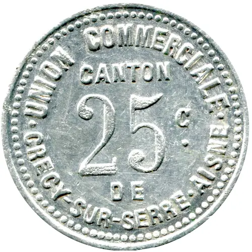 | Obverse lettering | · UNION COMMERCIALE · CANTON 25ᶜ· DE CRECY-SUR-SERRE·AISNE |