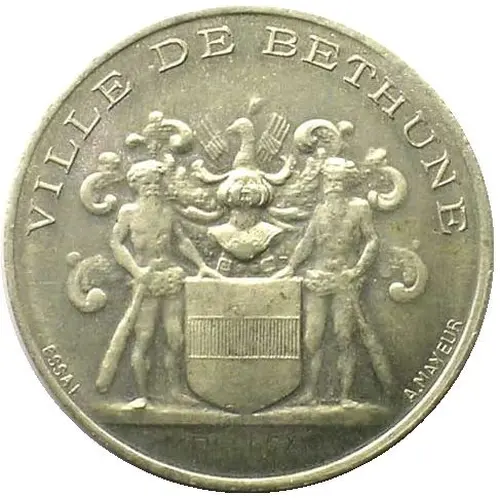 Technical/Grading: Struck in aluminium, a wartime material, this pattern would typically exhibit a sharp, precise strike, benefiting from careful production. High-points include raised lettering like "VILLE DE BÉTHUNE," the denomination, and any central motif. Aluminium's softness means even well-preserved patterns often show minor contact marks. A top-tier example displays full, original luster, exceptional clarity across its 30mm flan, and minimal surface imperfections, attesting to its initial, uncirculated state.
