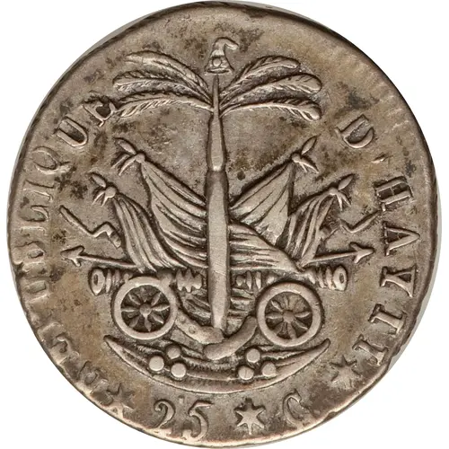 Artistry: The engraver for this issue remains anonymous, characteristic of early Haitian minting. Stylistically, the coin reflects a nascent Neoclassical aesthetic, prevalent in post-revolutionary states aiming to embody ideals of liberty and republicanism. The obverse displays a Phrygian cap of liberty on a pole, flanked by fasces, symbols referencing classical antiquity for freedom and unity. The inscription "REPUBLIQUE D'HAITI" encircles these motifs. The reverse presents "25 CENTIMES" and date "1817" within a laurel wreath, with "LIBERTE EGALITE".