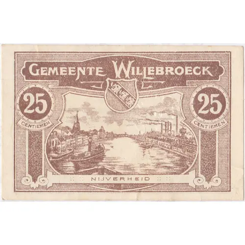 GEMEENTE WILLEBROECK 25 25 CENTIEMEN CENTIEMEN NIJVERHEID (Translation: Commune de Willebroeck. 25 centimes. Industrie.) |