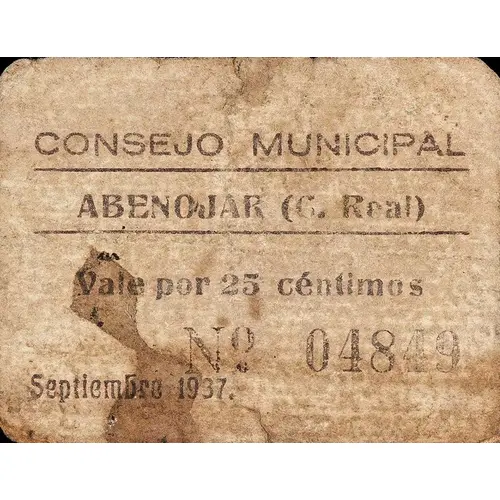 CONSEJO MUNICIPAL ABENOJAR (C. Real) Vale por 25 céntimos Septiembre 1937. (Translation: Municipal Council Abenójar (Ciudad Real) Valid for 25 Centimos September 1937.) |