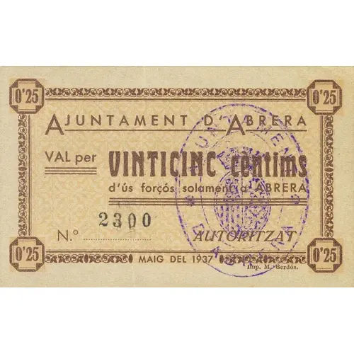AJUNTAMENT D`ABRERA VAL per VINTICINC cèntims d`us forçós solament a ABRERA AUTORITZAT MAIG DEL 1937 (Translation: Abrera City Council Valid for Twenty Five Centimos for forced use only in Abrera Authorized May 1937) |